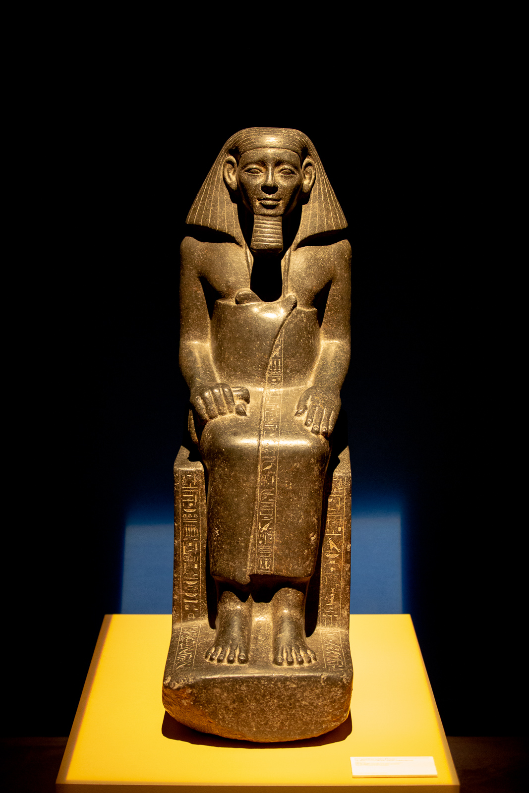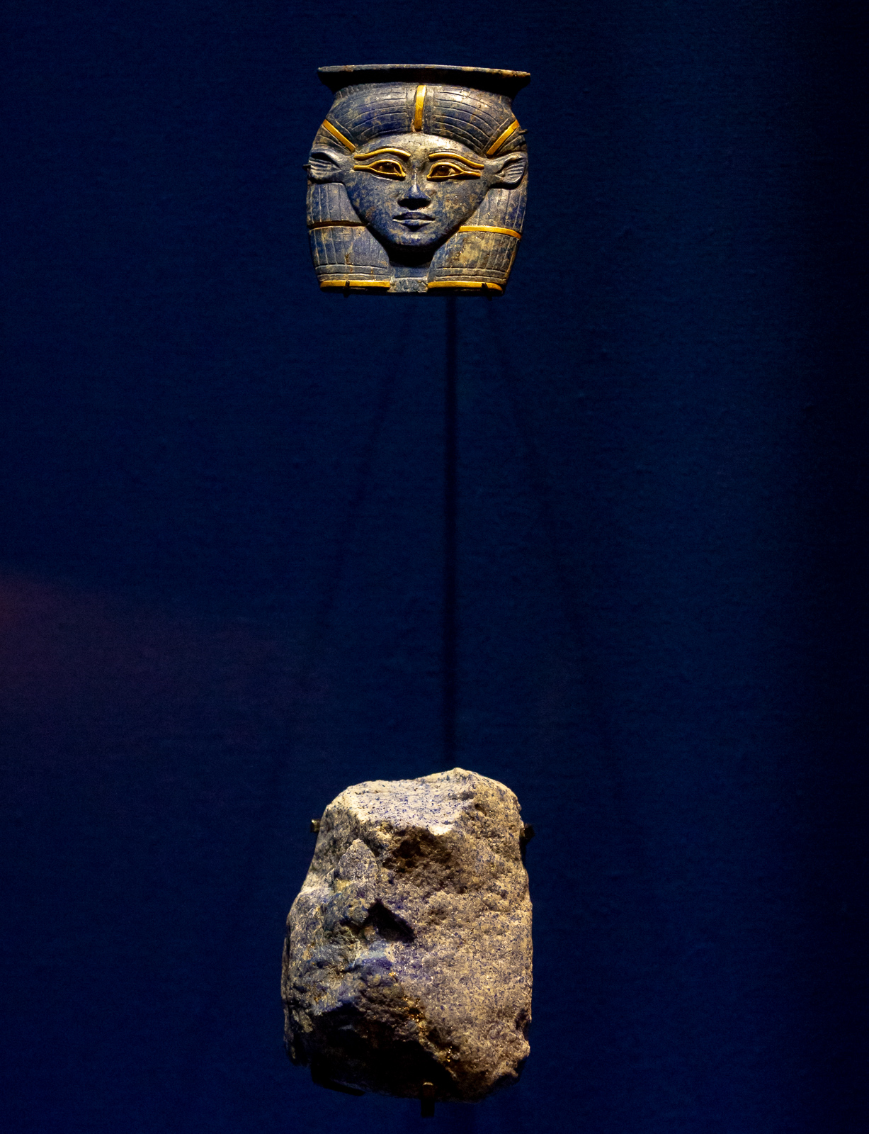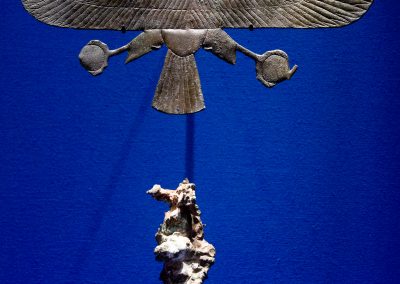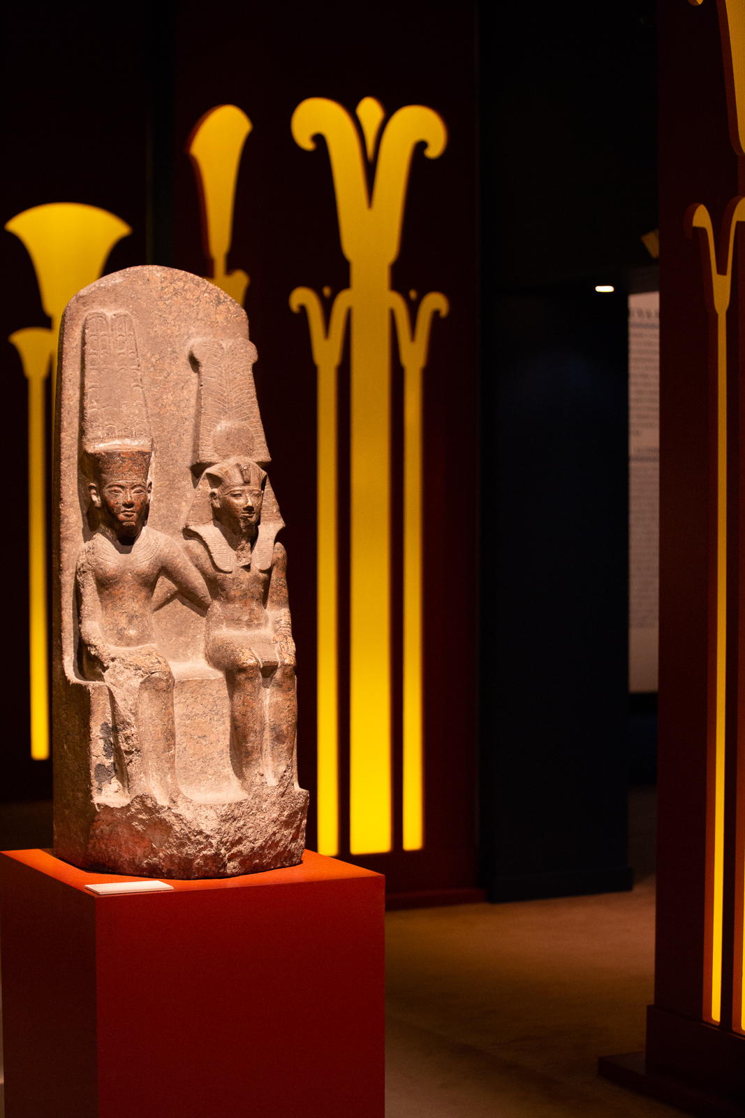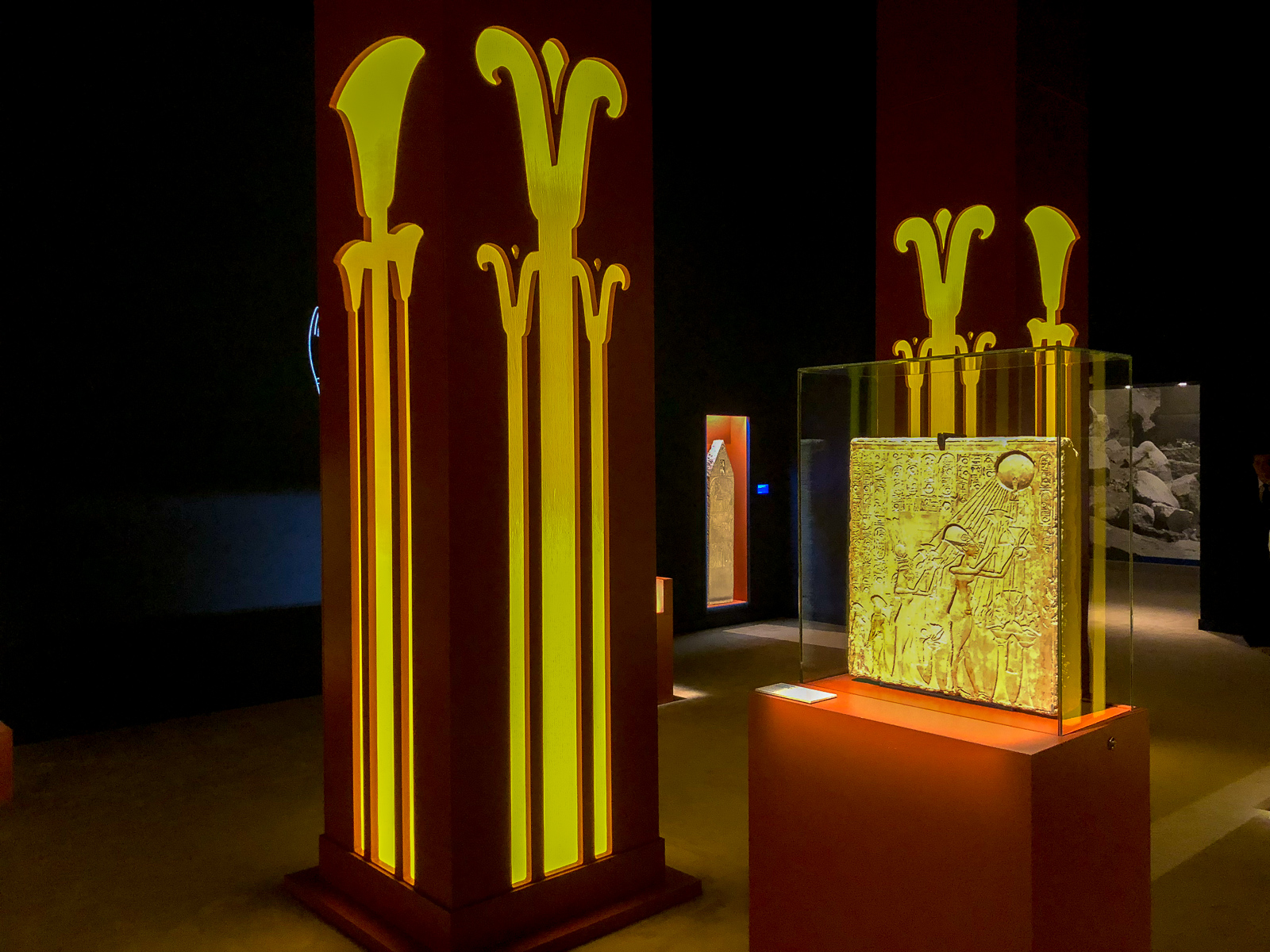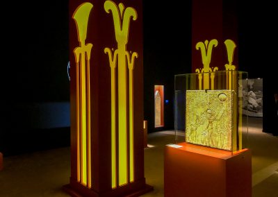 La visite est chronologique. La somptueuse scénographie utilise le bleu du « lapis-lazuli », couleur des Dieux et l’ocre qui évoque les vestiges d’architecture, piliers, pyramides, façades…