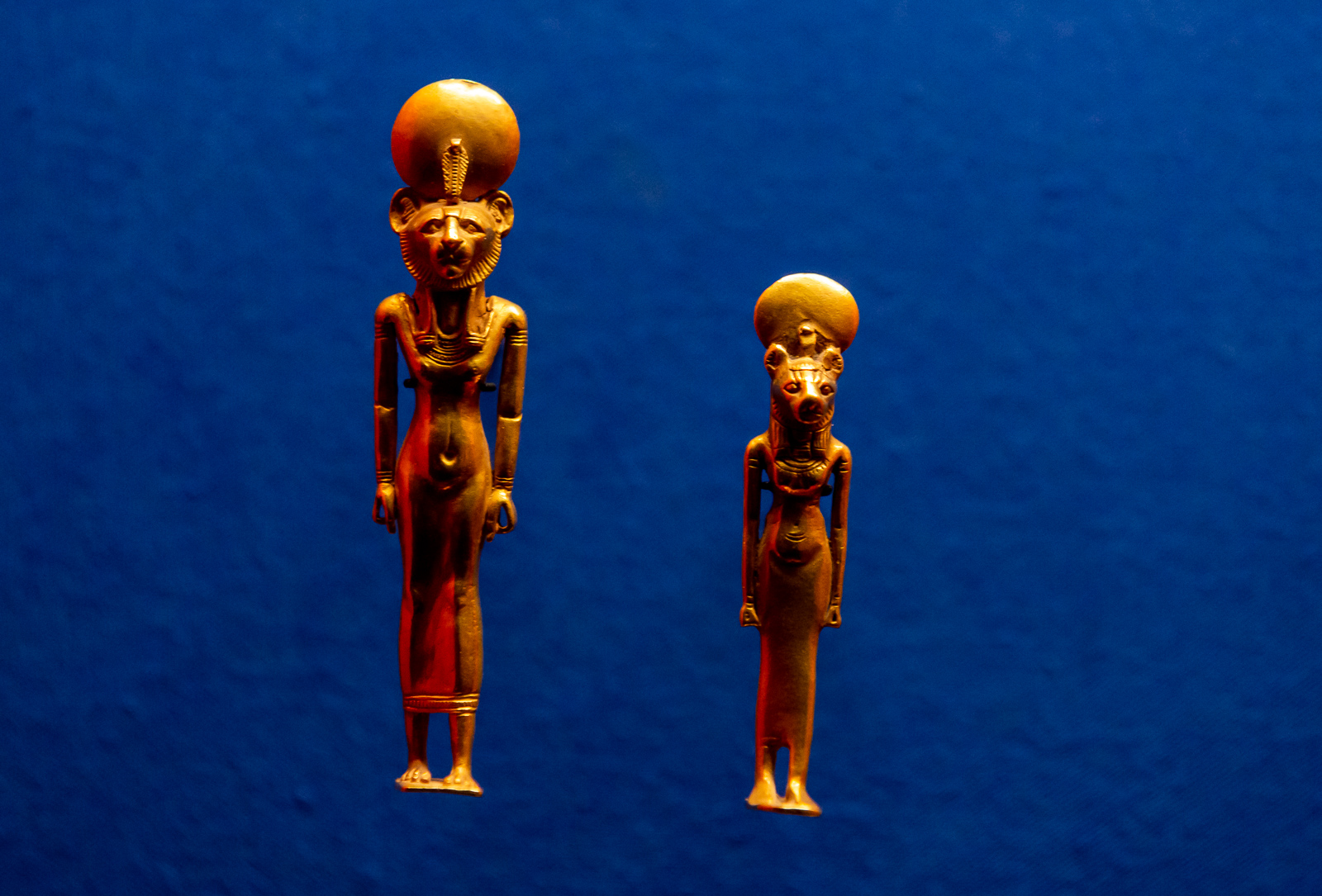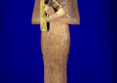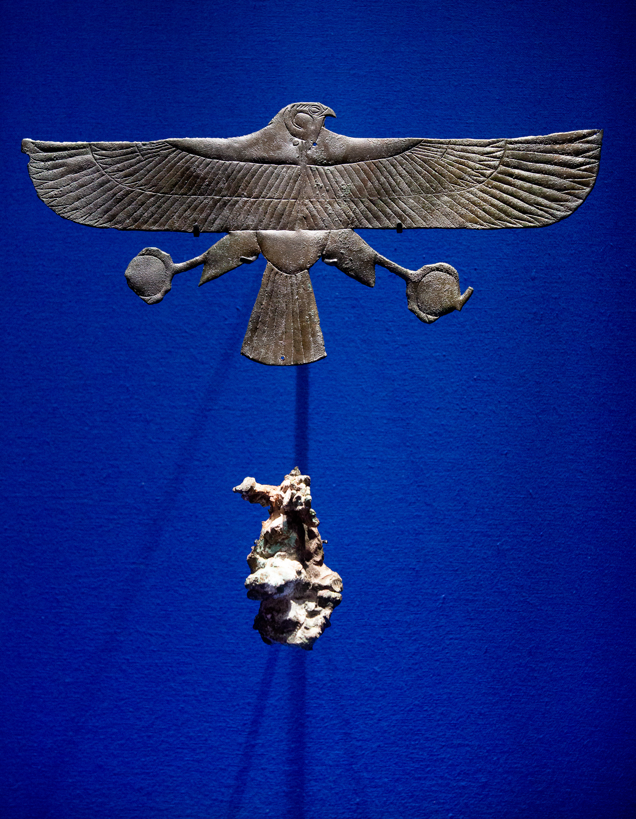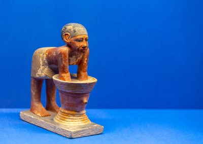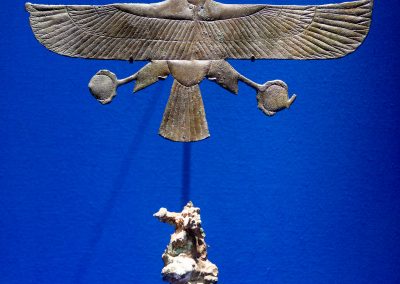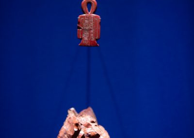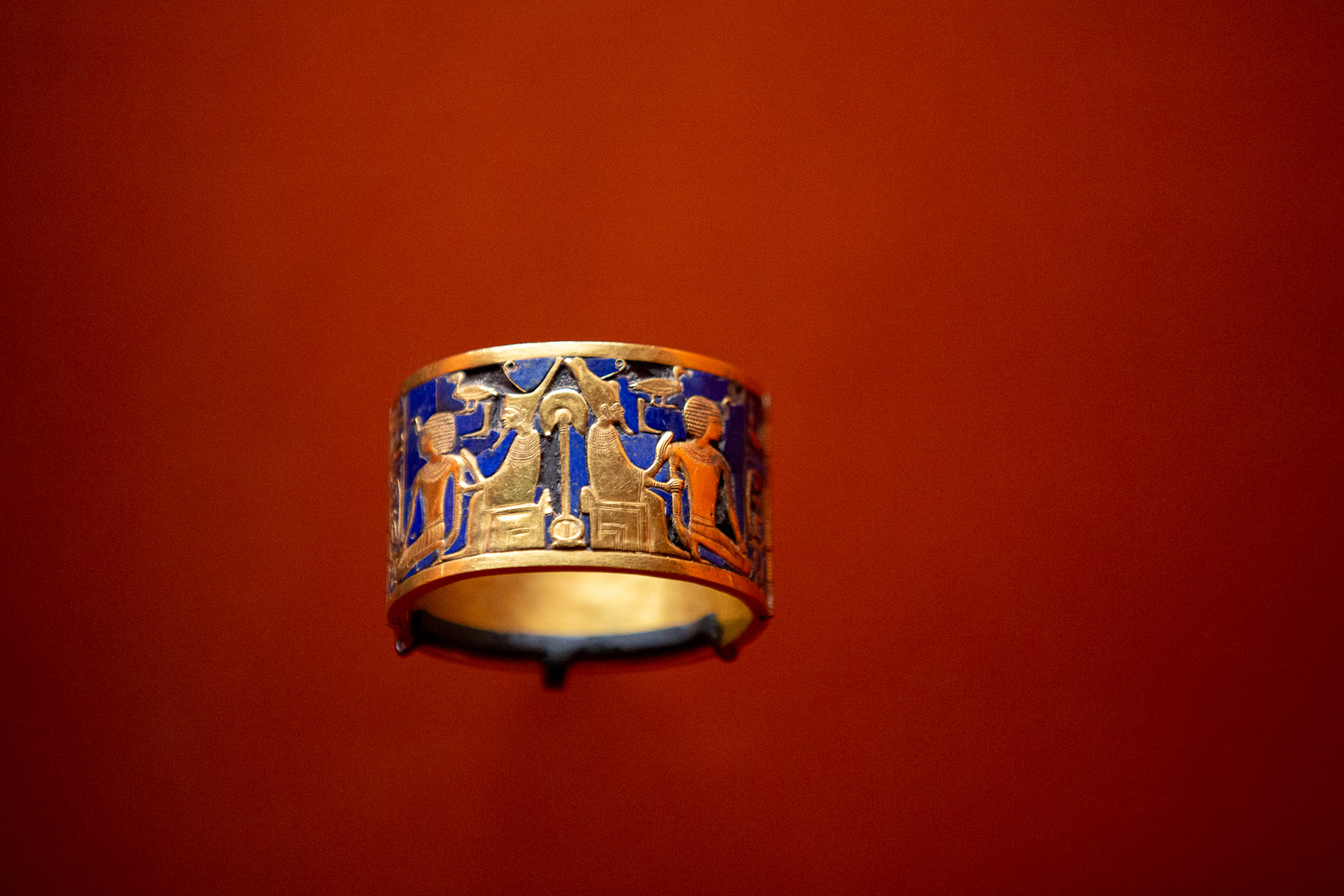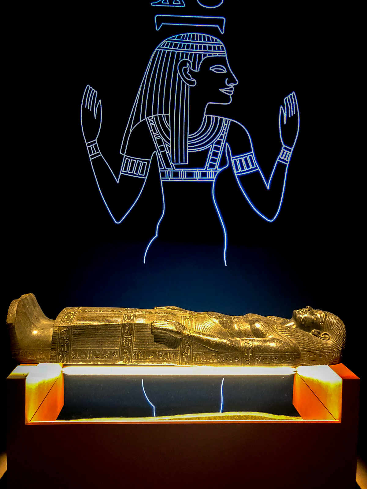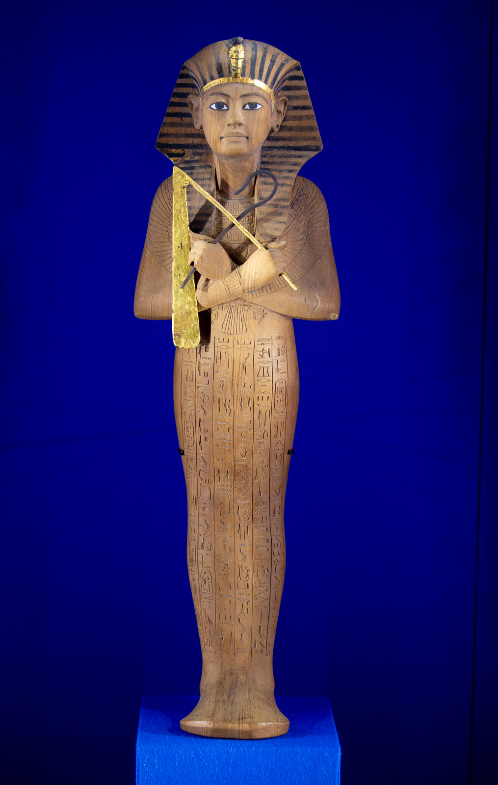 La visite est chronologique. La somptueuse scénographie utilise le bleu du « lapis-lazuli », couleur des Dieux et l’ocre qui évoque les vestiges d’architecture, piliers, pyramides, façades…