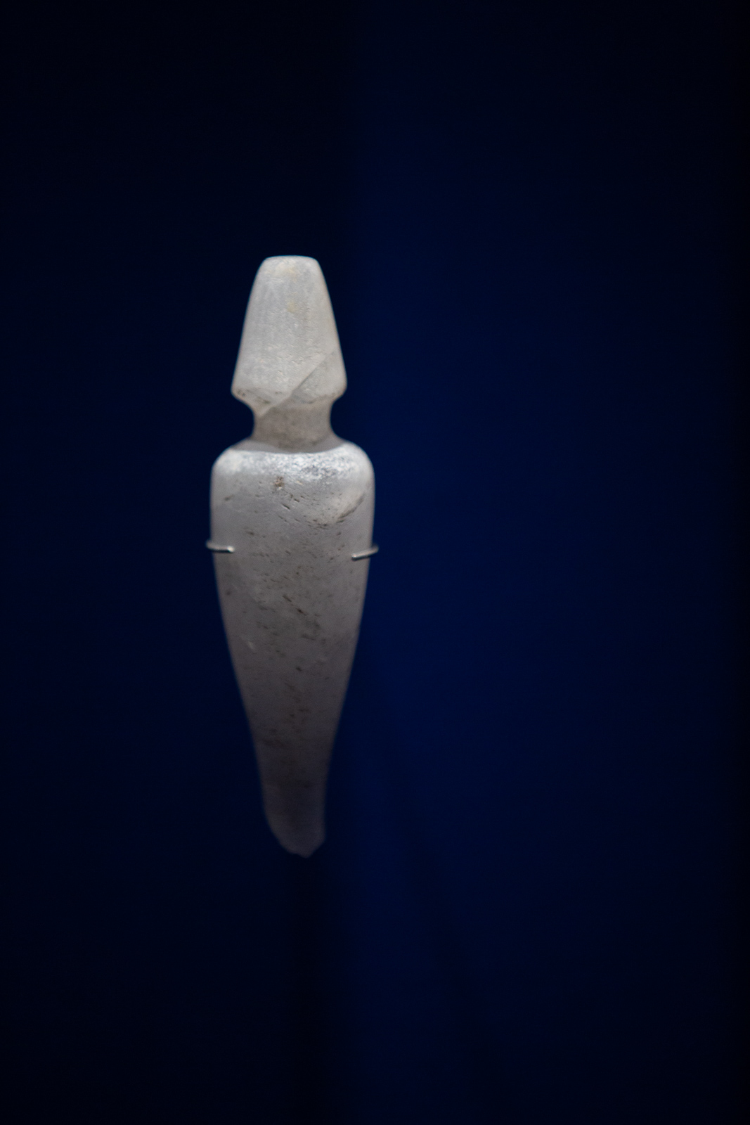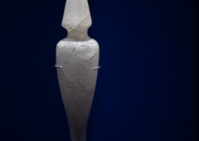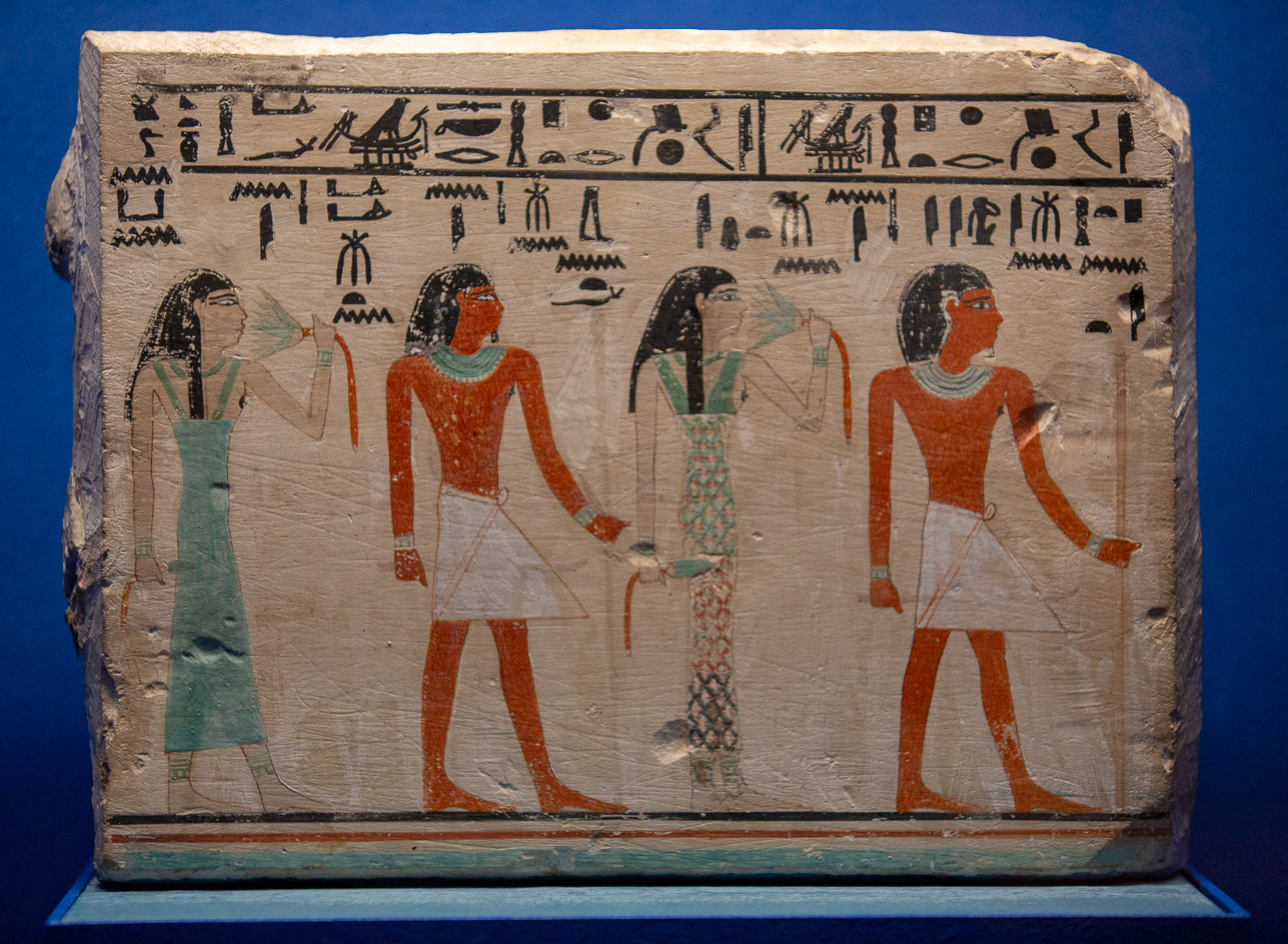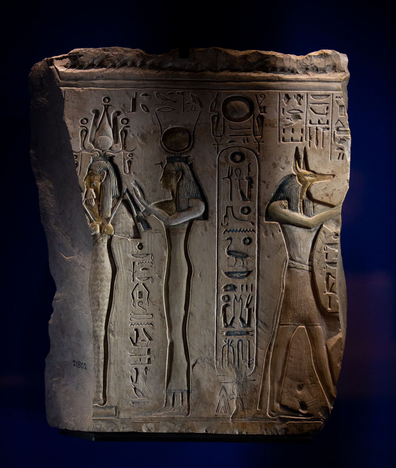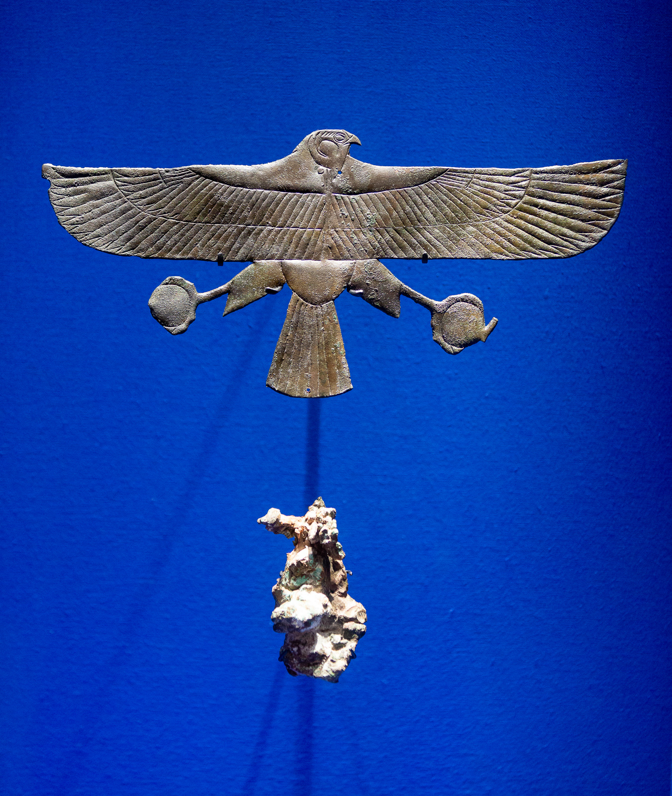 La visite est chronologique. La somptueuse scénographie utilise le bleu du « lapis-lazuli », couleur des Dieux et l’ocre qui évoque les vestiges d’architecture, piliers, pyramides, façades…